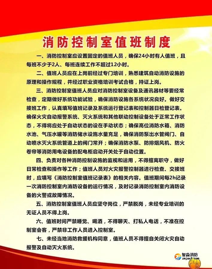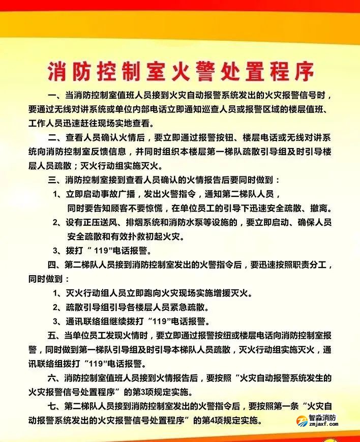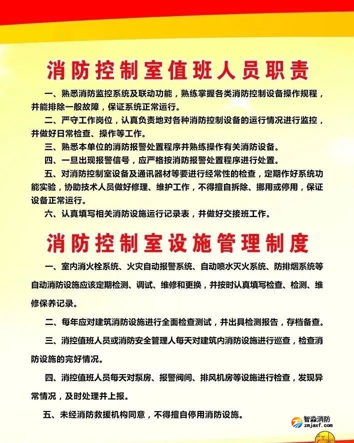 一、場地設置要求 標準 細則 單獨建造的消防控制室的耐火等級不低于二級、能直通室外或安全出口。 控制室不能有與消防控制設備無關的電氣線路和管路穿過。 不能與除監控室之外的其他功能用房合用,需要合用的,與其他部位進行防火分隔的門應設置為乙級以上防火門。 附設在建筑物內的消防控制室設置在建筑物的首層或地下一層。 控制室內不能存放與設備運行無關的雜物。 控制室環境干凈整潔,便于人員值守。 二、人員配置要求 標準 細則 “消防控制室人員信息公示牌”應有消防安全責任人、消防安全管理人、消防控制室值班人員、檢測單位技術負責人、維護保養單位技術負責人等基本信息。 值班人員能熟練掌握消防聯動控制器自檢、查詢、屏蔽、復位、消音、打印、顯示、自動手動切換等基本功能,會正確報告火警、啟動應急處置預案。 值班人員會遠程啟動噴淋泵、消火栓泵、防排煙風機,會操作消防栓泵和噴淋泵的啟停及自動與手動轉換、會手動啟動防排煙風機、會檢查測試末端試水裝置、會運用壓力開關直接啟動噴淋泵、會使用消防廣播引導疏散。 三、硬件設置要求 標準 細則 自動噴水滅火系統、消火栓系統、防排煙系統、消防應急廣播等聯動控制系統要處于自動狀態。控制室聯動控制器宜能顯示消防水箱、消防水池液位狀態。 消防電梯、消防水泵房、備用發電機房、變配電室、通風和空調機房、排煙機房、消防電梯機房及其他與消防聯動控制有關的且經常有人值班的場所要設置消防電話;設有消防電梯的場所,消防電梯要能回降首層并開門待用,聯動控制器要能顯示消防電梯反饋信號及運行時所在樓層、能顯示消防電梯的故障及停用狀態。 四、日常管理要求 標準 細則 落實24h雙人值班制度(與消防遠程控系統聯網的,可以實行單人值班),現場值班人員要持證上崗。 要詳細填寫控制室值班記錄、消防設施設備運行記錄,詳細記錄屏蔽及故障原因,如實記錄火警信息及應急處置情況。 要制定應急處置預案,按照預案組織演練。 建筑消防設施要進行年度檢測并取得檢測報告。 在控制室內醒目位置懸掛“消防控制室人員信息公示牌”。 消防控制室值班制度、消防控制室值班人員職責、建筑消防設施維護管理制度、消防控制室火警處置程序、消防控制室火災狀況處置程序等5塊制度牌上墻。