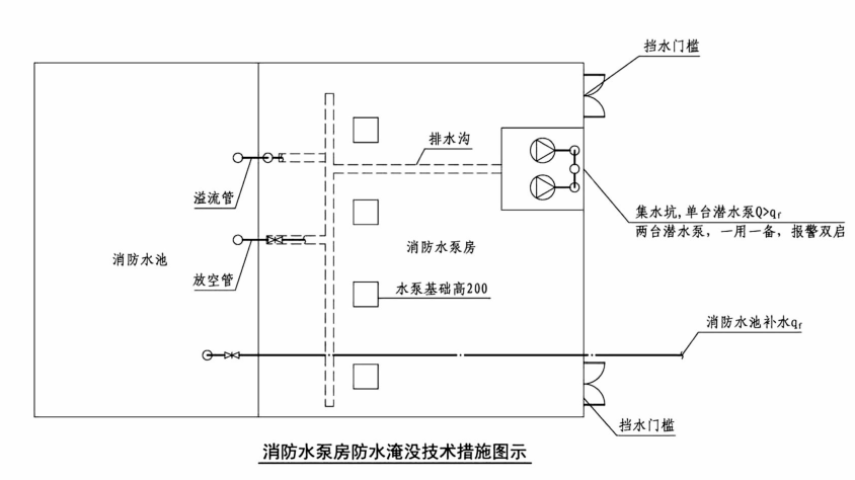 該區域發生積水倒灌的風險遠高于淺層地下空間,火災時樓內滅火需大量用水,一旦排水系統失效,水泵房易被浸泡,直接導致消防水泵無法啟動,喪失滅火供水能力。規范圖集中要求設壓力排水和擋水門檻,就是為了減少水淹風險。