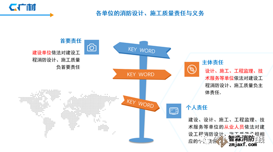 ?2009年4月30日,《建設工程消防監督管理規定》(公安部106號令)規定實施建設工程消防設計審查驗收職責的具體辦法。“第三條 建設、設計、施工、工程監理等單位應當遵守消防法規、國家消防技術標準,對建設工程消防設計、施工質量和安全負責。公安機關消防機構依法實施建設工程消防設計審核、消防驗收和備案、抽查。"