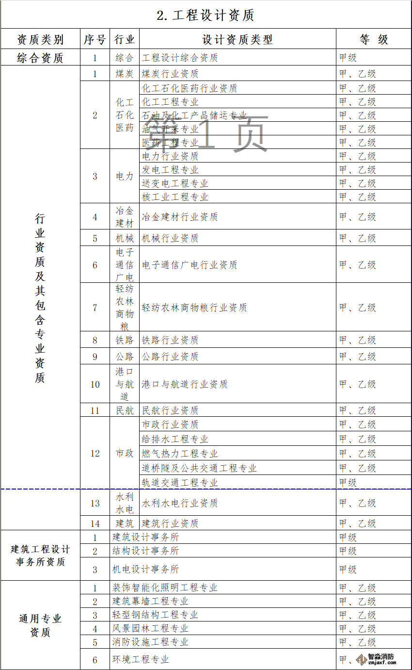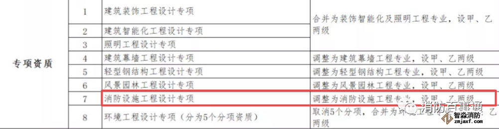 專項設計資質中,將消防設施工程設計調整為消防設施工程專業,設甲、乙兩級。
