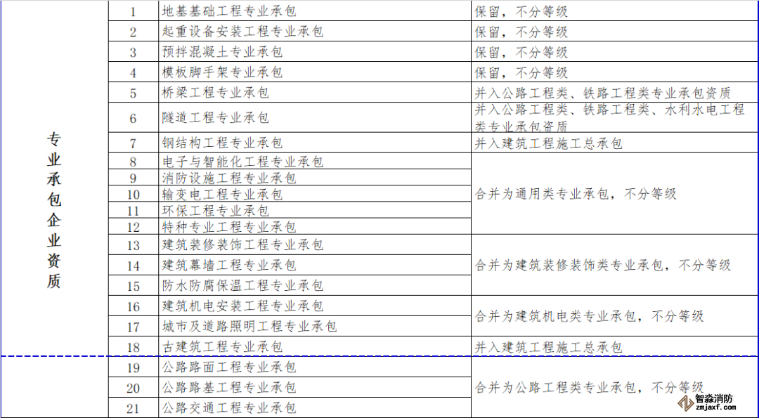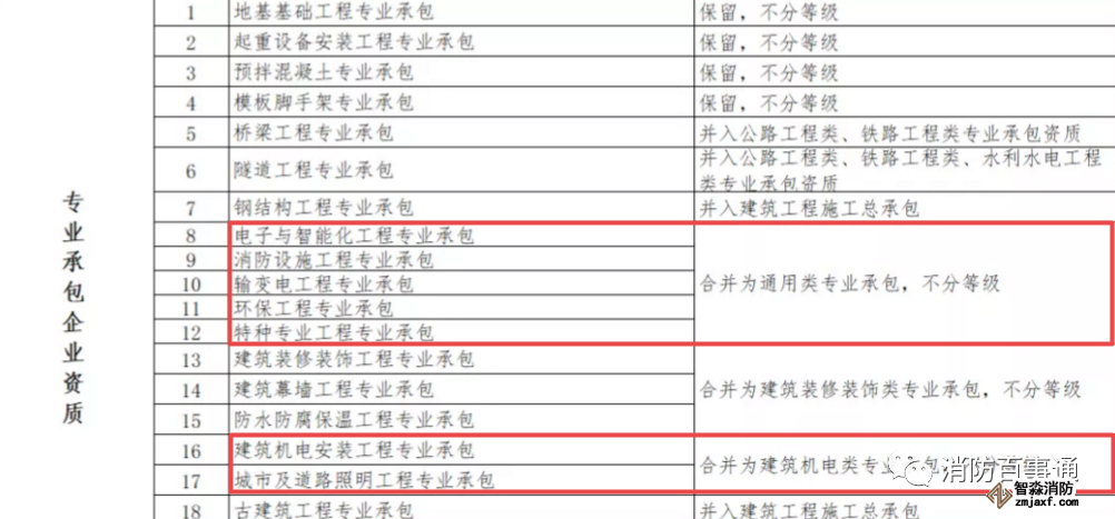 消防設施施工專業承包資質和其他幾項資質合并為通用類專業承包,不分等級。
