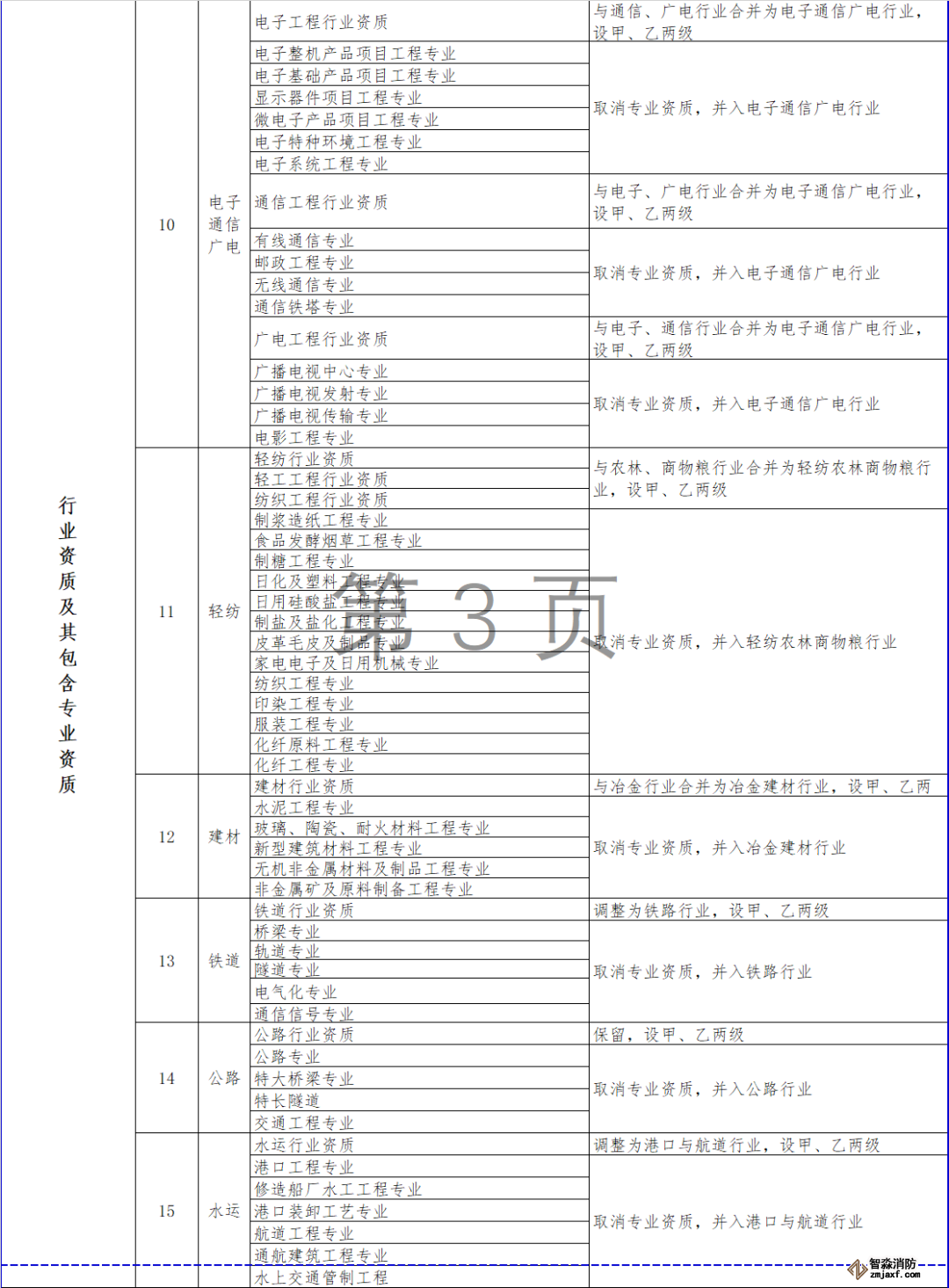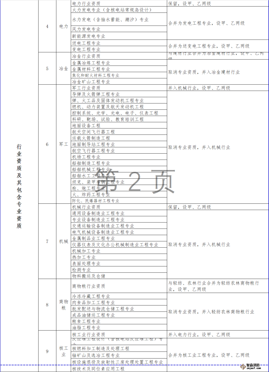 對部分行業資質進行整合,其中,冶金行業與建材行業合并為冶金建材行業資質,輕紡行業、農林行業、商物糧行業合并為輕紡農林商物糧行業,電子行業、通信行業、廣電行業合并為電子通信廣電行業,石油天然氣行業并入化工石化醫藥行業,軍工行業并入機械行業,核工業行業并入電力行業,資質等級壓減為甲、乙兩級,原丙級資質并入相應行業乙級資質。