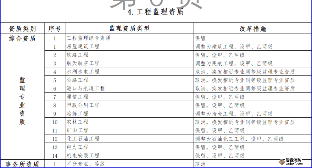 (四)工程監理資質。保留綜合資質。取消水利水電工程、公路工程、港口與航道工程等專業資質,其資質要求執行有關行業主管部門規定。取消農林工程監理資質,建設單位委托農林工程監理業務時,不再作資質要求。上述4個監理專業資質取消后,相關企業可以換發相近專業同等級監理專業資質。監理專業資質等級壓減為甲、乙兩級,原丙級資質并入相應專業的乙級資質。取消事務所資質。