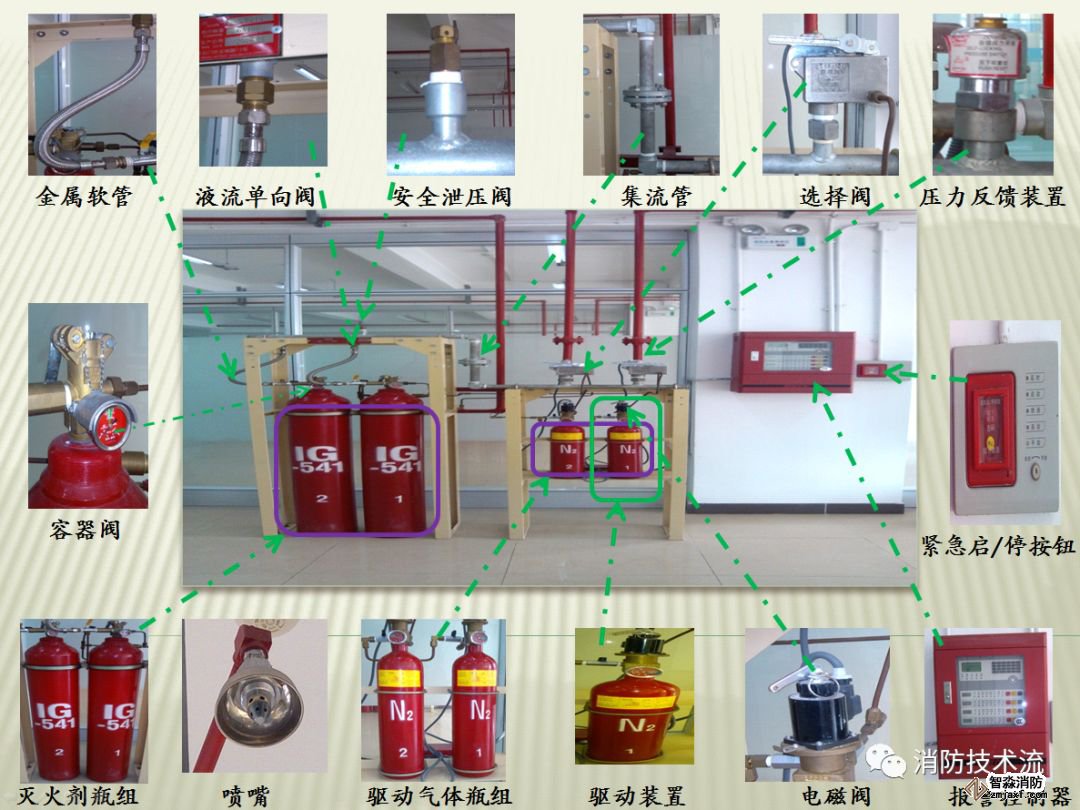 滅火劑瓶組、容器閥、單向閥、集流管、安全泄壓閥、選擇閥、驅動裝置、驅動氣體瓶組、壓力反饋裝置、噴頭、火災報警控制器、噴嘴、管道管件及吊鉤支架等部件組成。