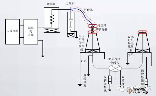 變頻諧振系統(tǒng)輸出的電源不能直接作為電纜局放試驗(yàn)的電源直接施加于被試對象進(jìn)行局部放電測試,必須采取有效措施對試驗(yàn)電源進(jìn)行預(yù)處理,通過設(shè)置串聯(lián)電抗、防暈導(dǎo)線、均壓環(huán)進(jìn)行對試驗(yàn)電源質(zhì)量進(jìn)行改善,其電氣原理所下圖所示。