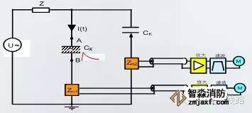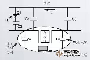 在電纜的中間接頭,測試原理如圖所示,一側(cè)電纜的鎧裝與電纜導(dǎo)體之間存在電容Ca,另一側(cè)電纜的導(dǎo)體與鎧裝之間存在電容Cb,如果在電纜的中間接頭發(fā)生局部放電,那么形成兩個(gè)電容C1和C2,此時(shí)Ca和Cb就會(huì)通過導(dǎo)體向C1和C2充放電,從而形成局放電流回路,在兩側(cè)電纜屏蔽層橋接一個(gè)高頻低阻的電容臂C0和高頻電流傳感器,就可以檢測到局放的脈沖電流信號。