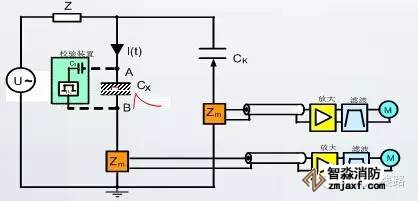 在被試驗(yàn)電纜Cx注入標(biāo)準(zhǔn)局放信號Qo以模擬被試對象發(fā)生了局部放電,當(dāng)標(biāo)準(zhǔn)局放信號注入時(shí),檢測阻抗Zm1、Zm2輸出信號,測試系統(tǒng)M獲取局放信號的幅值大小、相位分布特征、頻譜特性等信息。